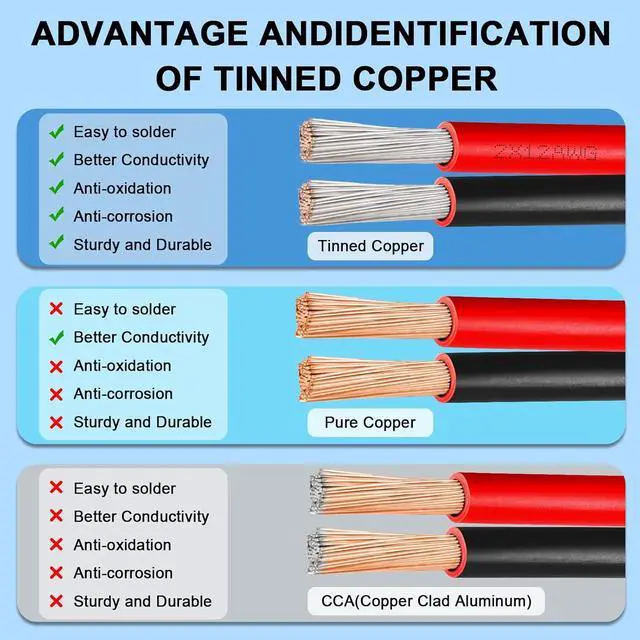 Conductor: High purity Stranded oxygen-free copper with tin-plated, specification features high conductivity, low resistance and soft, can be bent arbitrarily, easy to welding, stripping, crimping terminals,connect,cut.