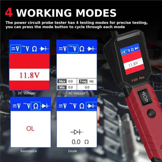 4 Testing ModesFeaturing four distinct testing modes this automotive circuit tester provides accurate diagnostics for various electrical issues, simply press the mode button to cycle through each setting allowing for quick identification of shorts opens and other common electrical problems in vehicle wiring systems