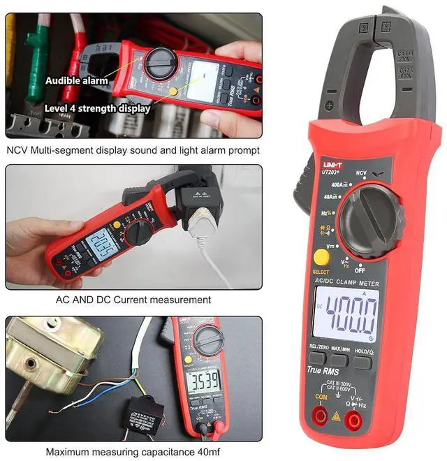 True RMS LCD backlight Large screen and display digits 60mF large capacitance measurement (UT202A+/UT204+) Neutral/live wire test (UT202A+/UT204+)