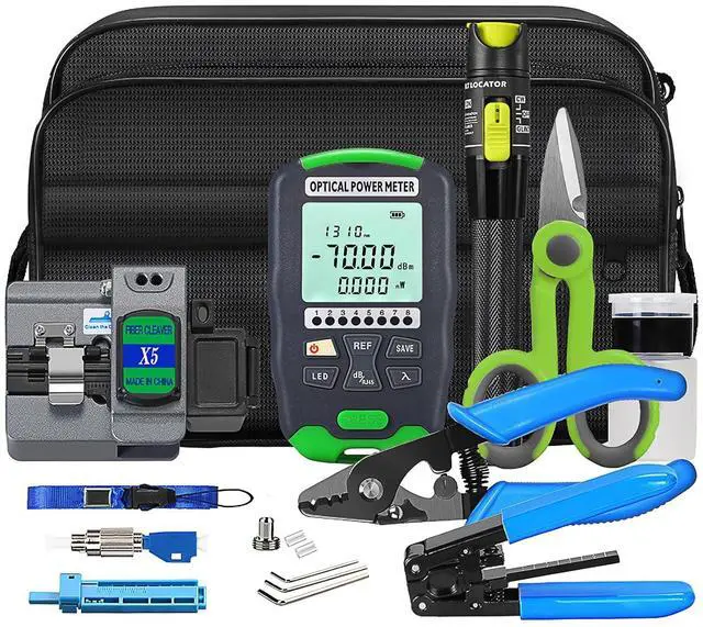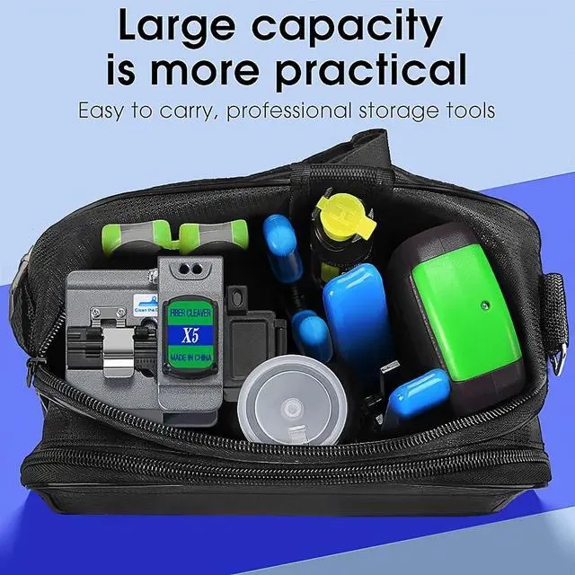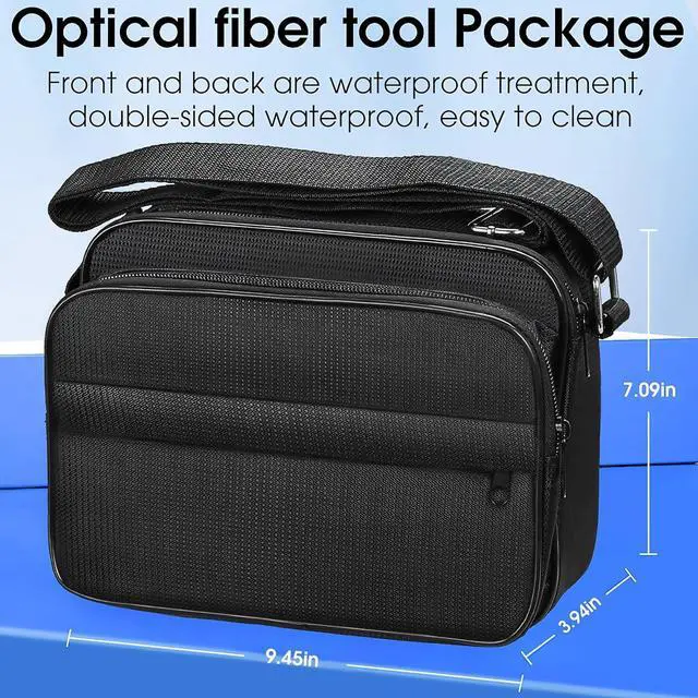 FTTH Equipent AccessoriesFiber optic tool bag,Optical Fiber CleaverVisual fault locator, optical power meter, fiber optic stripping pliers, cleaning bottle, cleaning paper, 2-in-1 fixed length device