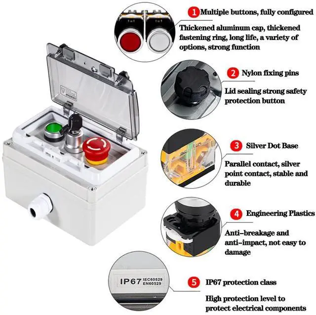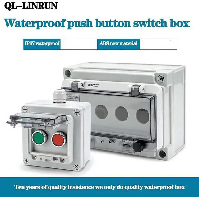 1.Product Name:push button box;Waterproof Rating:IP67;Material:ABS;Overall Size:175x 125 x 75cm/6.9" x 4.9" x 3"(L*W*H)