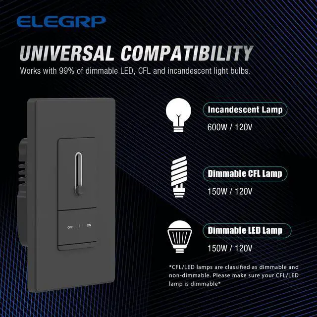 Universal Compatibility Works with 150W dimmable LED, 150W CFL and 600W incandescent light bulbs on the market. Set optimal dimming range for different bulbs with the initial brightness controller.