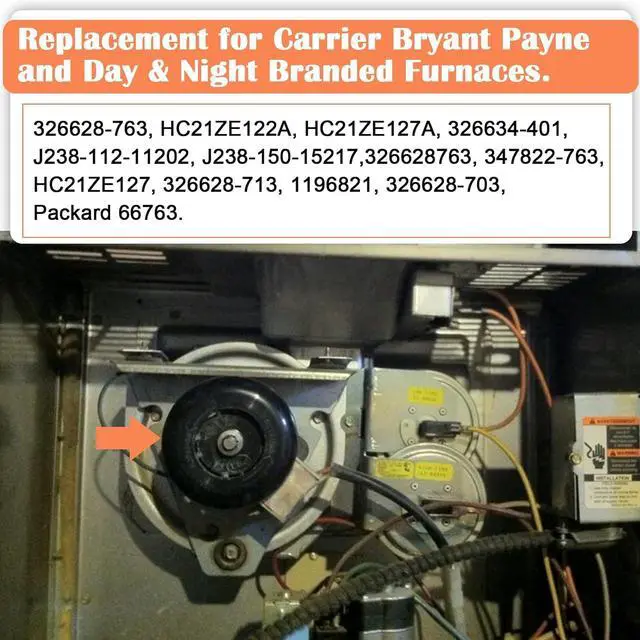 Compatible Models - Furnace Exhaust Draft Inducer Motor Assembly Fits Carrier Bryant Payne 326628-763, HC21ZE122A, HC21ZE127A, 326634-401, J238-112-11202, J238-150-15217, 326628763, 347822-763, HC21ZE127, 326628-713, 1196821, 326628-703 and Packard 66763. Draft Inducer Motor part number 20503. Designed for Carrier, Bryant, Payne, and Day & Night Branded Furnaces.