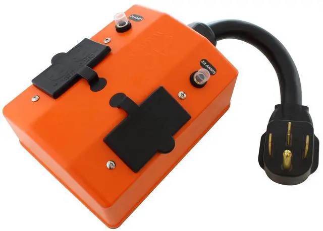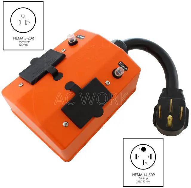 1.5ft Variation Comes With SEOW 8/4 Cable NEMA 14-50P, 50 Amp, 125/250 Volt, 4-Prong Male Plug Four NEMA 5-15/20, 20 Amp, GFCI T-blade Household Connectors (2) 24 Amp Breakers NEMA 14-50P to (4) 5-15/20R Power Distribution Cord 5-Year Limited Warranty