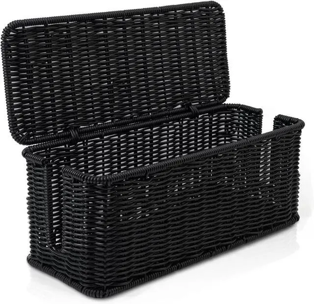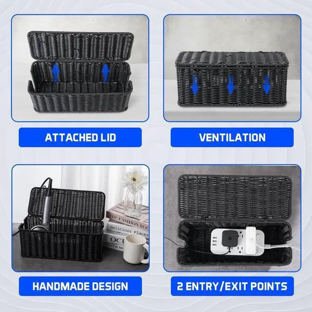 Elegant & Safe Handwoven Synthetic Rattan: Our Cantalop Cord storage organizer with attached lid boasts a handmade polypropylene rattan like plastic, adding a touch of rustic elegance to any room. This cable organizer is carefully designed to hide wires and improve your space with a charming touch.