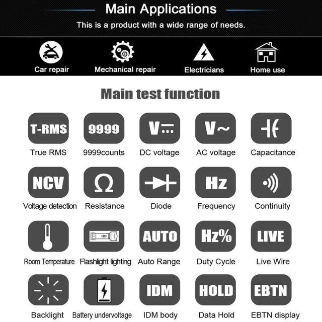 Application: The multimeter is widely used for capacitance test, diode test, continuity test, test, live wire detection, duty cycle and frequency test, etc.