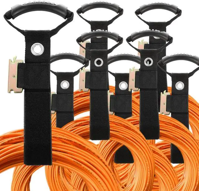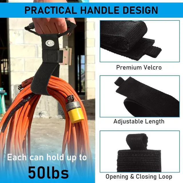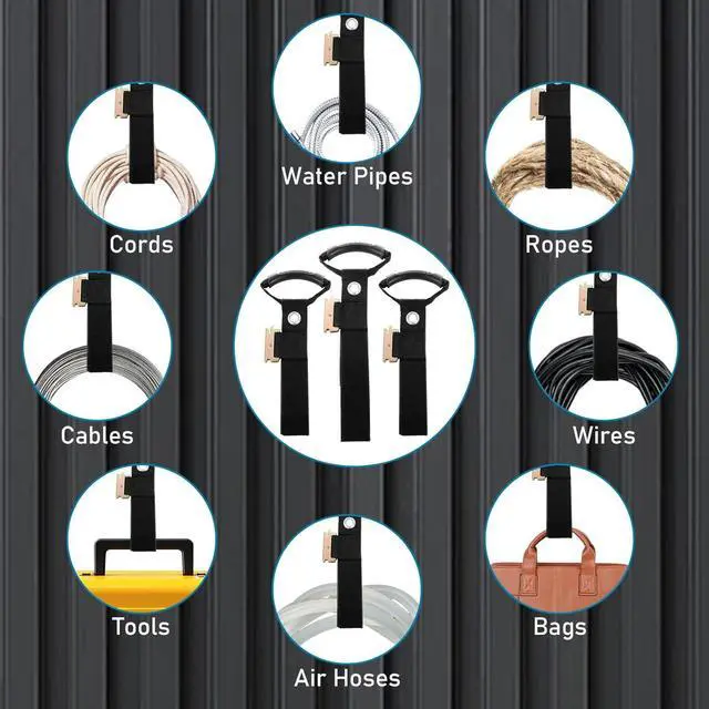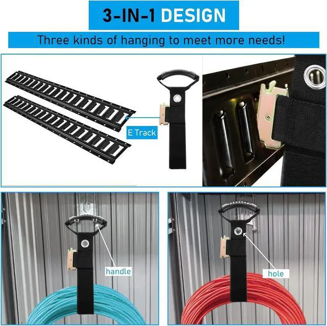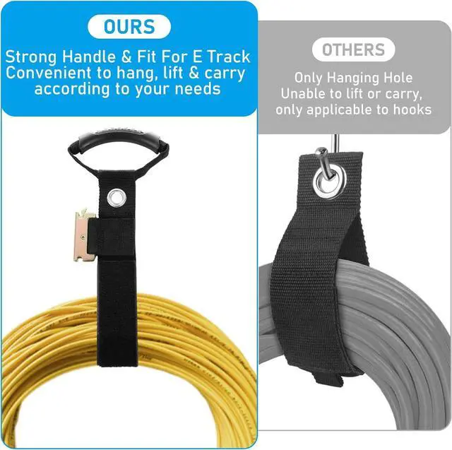 Superior Material: Made of reliable nylon straps and sturdy rubber handles, Extension Cord Hanger can support up to 50 pounds. The back of Hose Strap features metal fittings specifically designed for E-tracks, durable and reusable for over 6000 times.