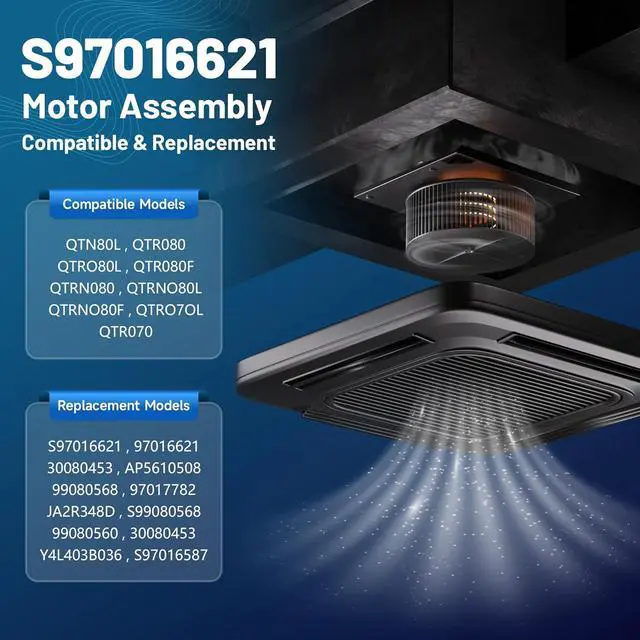 Reliable Replacement for Bathroom FansHigh-quality replacement motor assembly for bathroom exhaust fans. Engineered to restore airflow and eliminate excess moisture, compatible with part numbers S97016621 and S99080568.