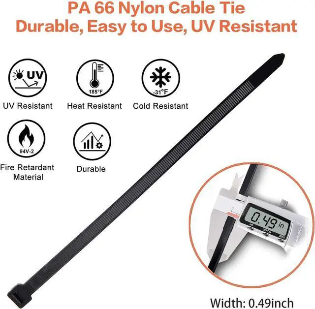 PREMIUM PLASTIC ZIP TIESMade of strong, durable industrial nylon 6/6 fire resistant material, lab-tested for temperatures ranges from -31 to +185 (-35 to +85). Multi-Used nylon cable ties for Indoor and Outdoor Use. UV Resistant.
