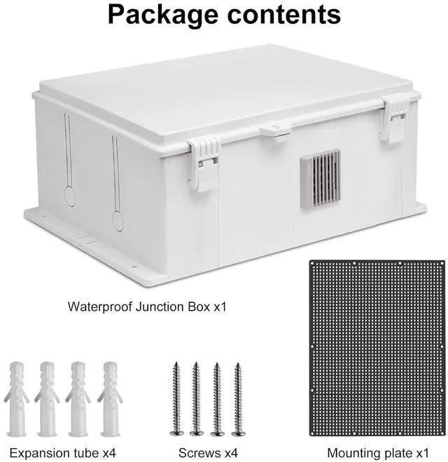 Easy to installThe waterproof box comes with a removable grill mounting plate, so you can easily install the equipment in the waterproof plastic box. Equipped with mounting screws, the outdoor electrical box can be hung on the wall or fence.