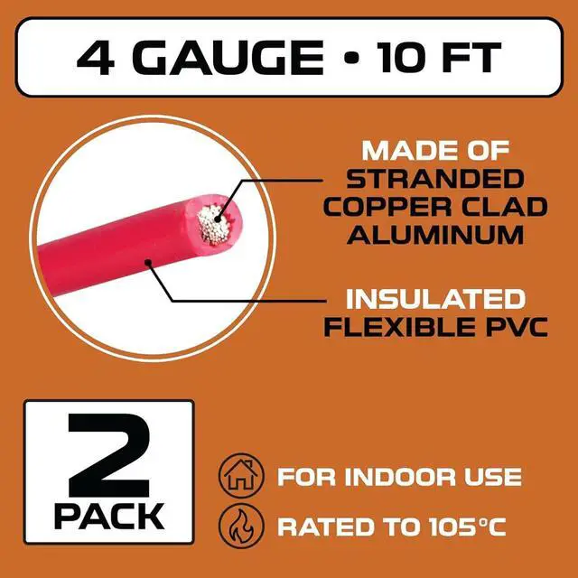 EASY POLARITY IDENTIFICATION & HEAT RESISTANT: Red and black colored jackets and ground wire simplifies installation, preventing polarity errors that could damage your audio equipment. Rated to 221°F / 105°C. 10 feet of 4 gauge power wire per roll. Stranded copper clad aluminum.