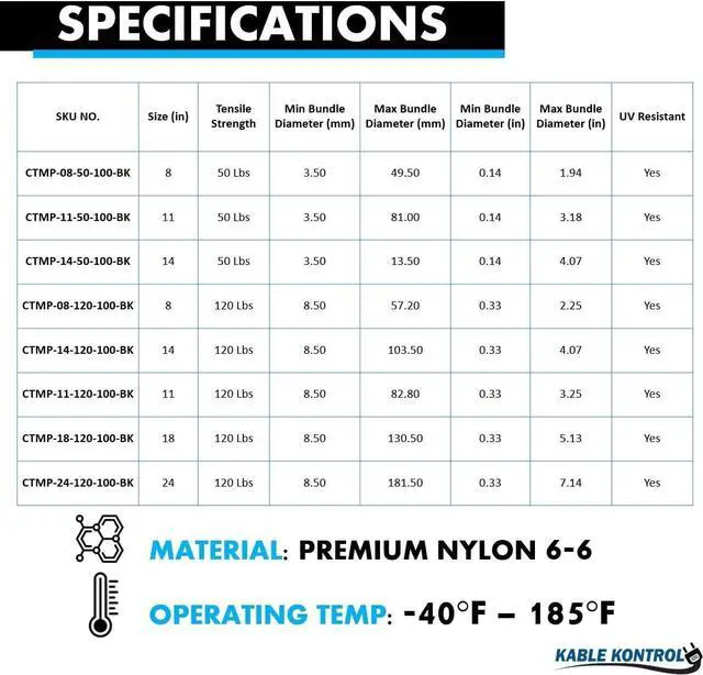 Dimensions: 14 Inch Long | 100 Pcs/Pack | Black | 120 Lbs. Strength | UV Resistant | Nylon & Stainless Steel | Temp Range: -40°C 85°C (-104° F 185°F)