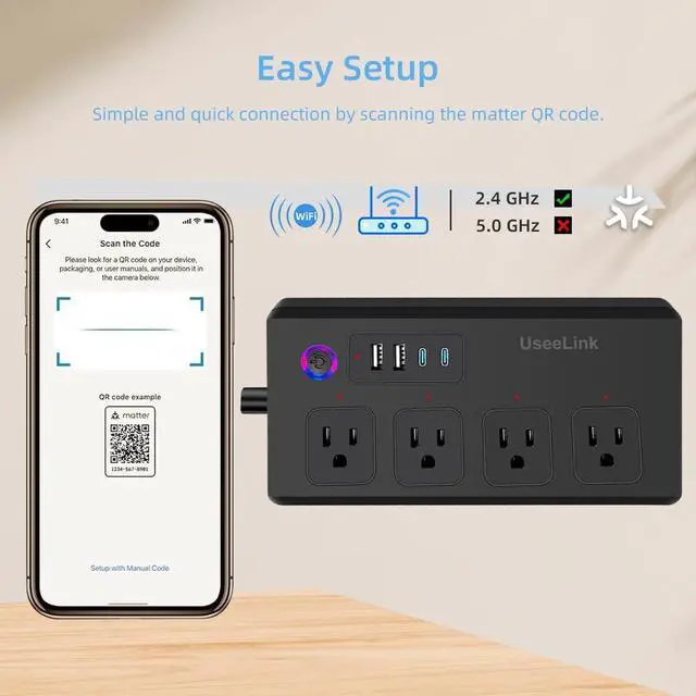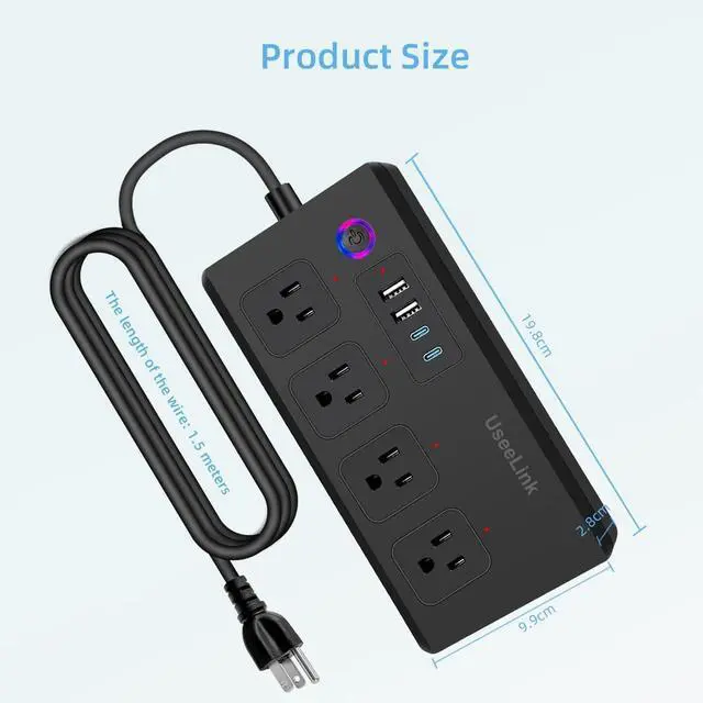 4 in 1 power strip: UseeLink extension cord flat plug with 4 widely AC outlet, 3 USB and 1 USB-C port desktop charging station with 5 ft power cord ETL listed power strip deliver power for up to 8 devices.