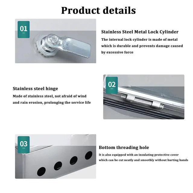 3. Junction box with safety lock: The junction box adopts a high-strength hinge cover design and is equipped with a safety lock core to effectively prevent others from accidentally opening the electrical box and protect electrical equipment and personal safety. The thickened lock enhances the closing ability of the door and strengthens the firmness of the junction box.