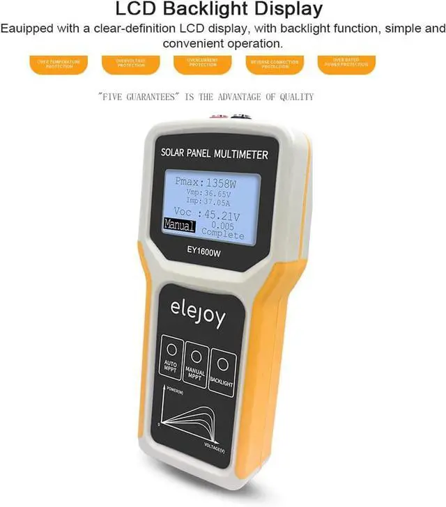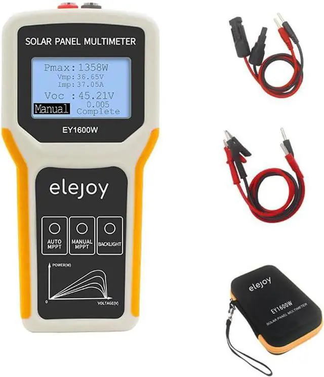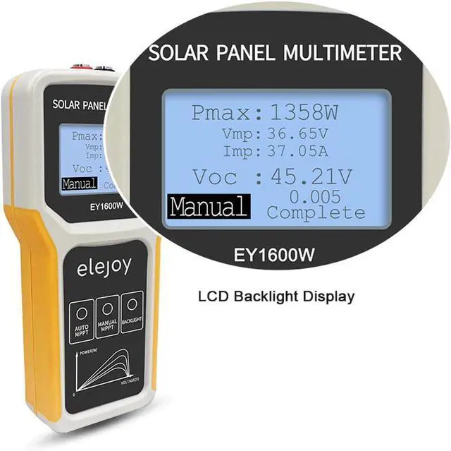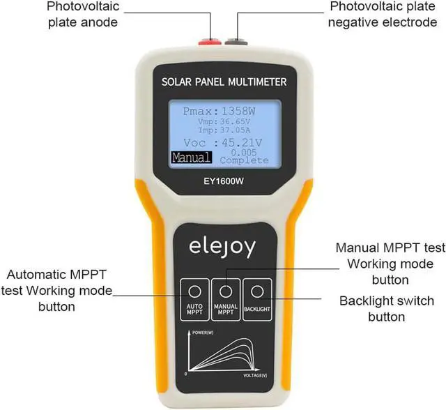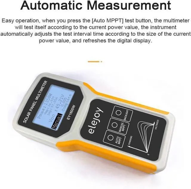 Multifunctional Design: 1600W PV panel multimeter, support auto/manual detection mode switch, measure PV panel maximum power point power, maximum power point voltage, maximum power point current, measure PV panel open circuit voltage.