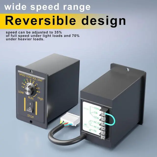 Reversible Variable SpeedThe AC motor's speed can be finely adjusted from 0 to 18 RPM, and capable of rotation in both directions. This makes it ideal for applications requiring changes in rotation direction, such as conveyor belts or winches, providing precise control tailored to various tasks;