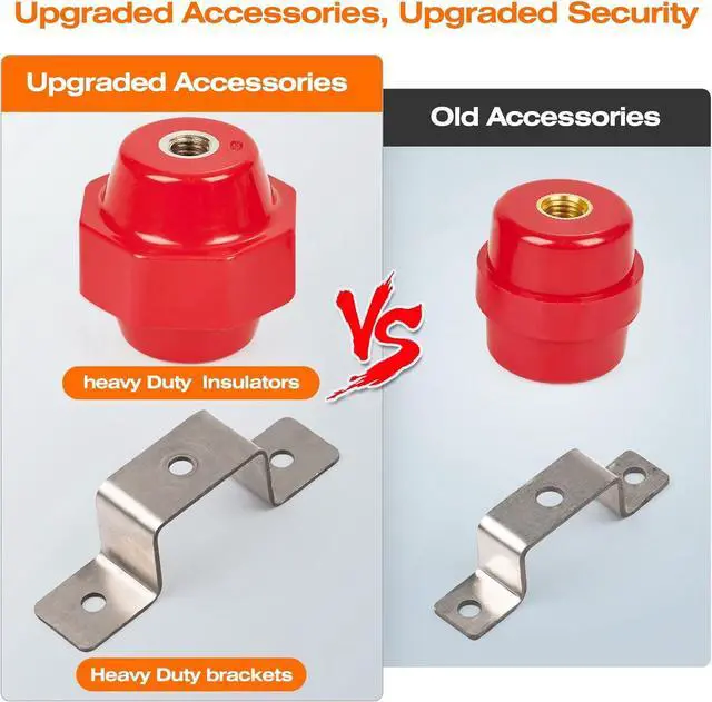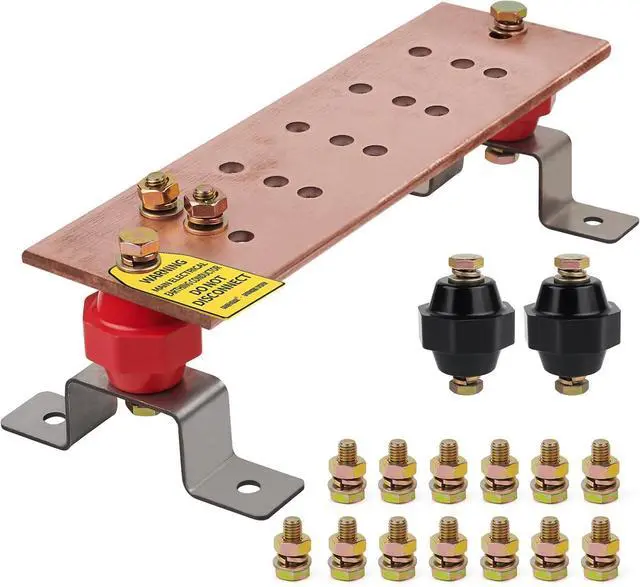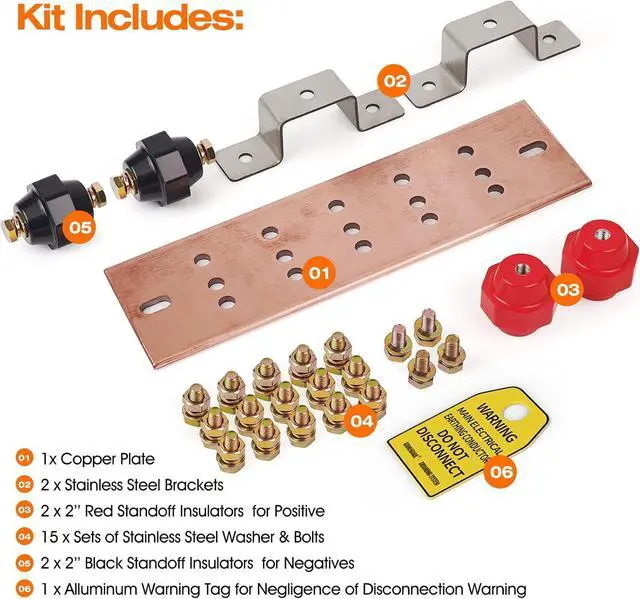 Kit Includes: 1x Copper bar, 2 x Stainless Steel Brackets, 2 x 2Red Standoff Insulators for Positive and 2 x 2Black Standoff Insulators for Negatives, 15 x Sets of Terminal Bolts & Washer ,and 1 x Alluminum Warning Tag for Negligence of Disconnection Warning.