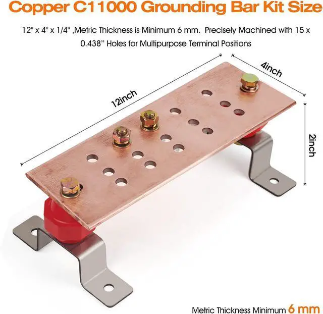 Grounding Bar Kit Dimension: 12" x 4" x 1/4" ,Metric Thickness is Minimum 6 mm. Precisely Machined with 15 x 0.438 Holes for Multipurpose Terminal Positions.