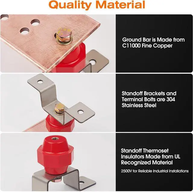 Quality Material: The Copper Bar is Pure and Made of C1100 Fine Copper. The 2X2 Standoff Thermoset Insulators are Made of UL Recognized Material, Rated 2500V for Reliable Industrial Installations. Standoff Brackets are 304 Stainless Steel.