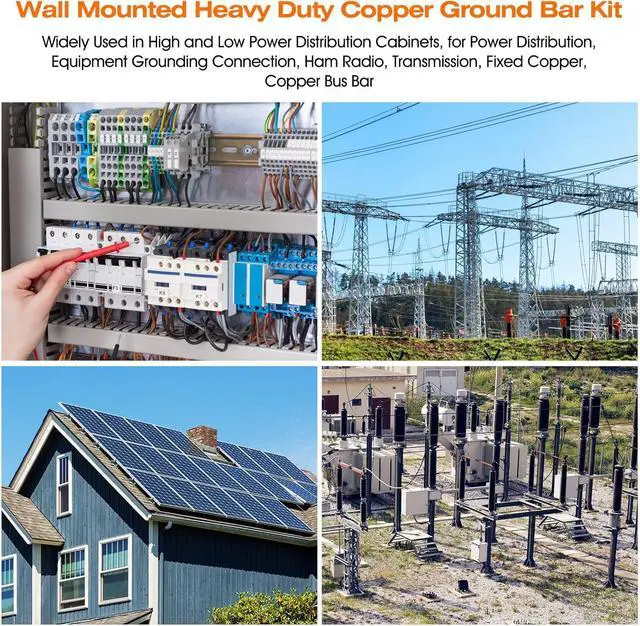 Wall Mounted Heavy Duty Copper Ground Bar Kit. Widely Used in High and Low Power Distribution Cabinets, for Power Distribution, Equipment Grounding Connection, Ham Radio, Transmission.