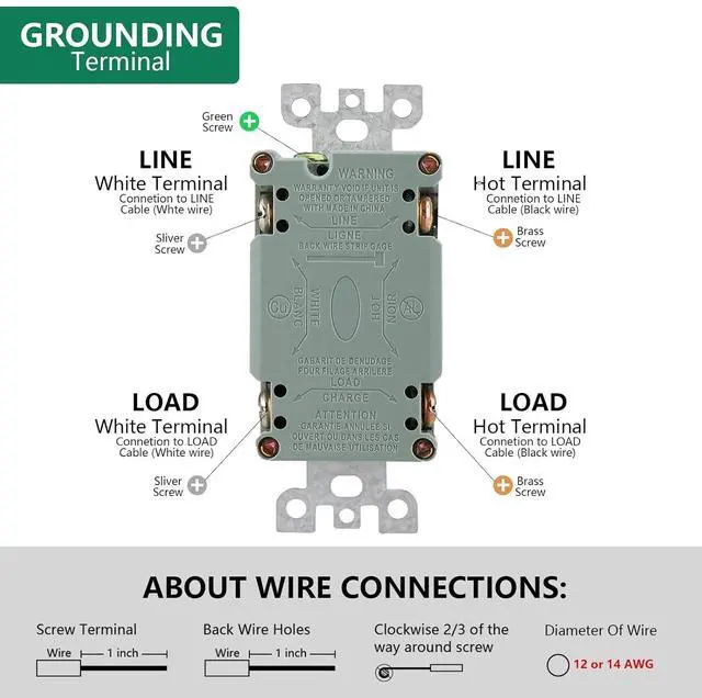 GFCI has two buttons, TEST and RESET. TEST button: test whether the GFCI function is working properly before use. It is recommended to test once a month. RESET button: When the outlet triggers the leakage protection, the RESET button pops up and the outlet will be turned off. Pressing RESET will re-energize the outlet. Green light on: RESET button pressed / it tripped (normal operation). Light off: no power supply/wrong wiring (check LINE and LOAD wiring)/failure (replace with new ones).