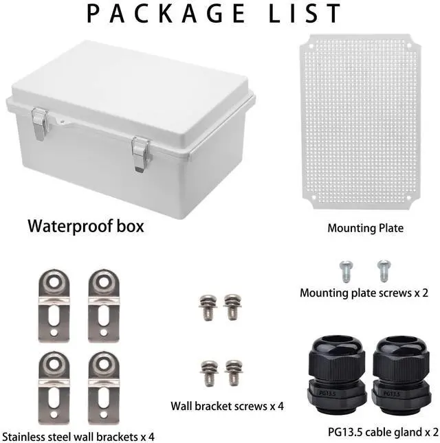PACKAGE - 1 x Weatherproof Junction Box, 1 x Mounting Plate, 2 x Cable Glands, 4 Stainless Steel wall brackets.