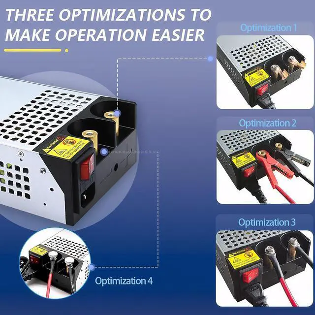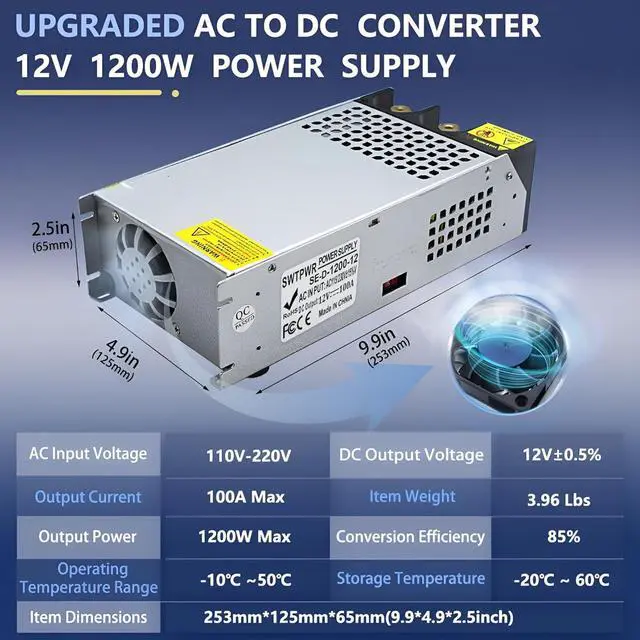 NEW VERSION AC TO DC CONVERTERNew Upgrade 1200W converter build with Imported Aluminum alloy shell ,Built-in wire integrated design, Dual power connection methods, Very convenient for 12V devices with clamps, SWTPWR's 100 amp power supply come with ul power cord ,12V power supply with switch ,wire lugs,metal clip and screw.Super convenient for devices with clamps. You can clamp to the two cylindrical contacts directly. It is a patent design of 12v dc power converter.