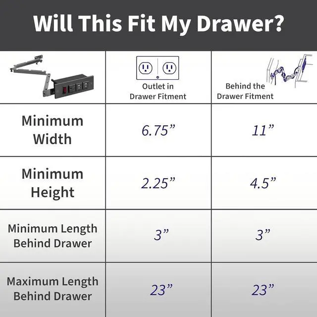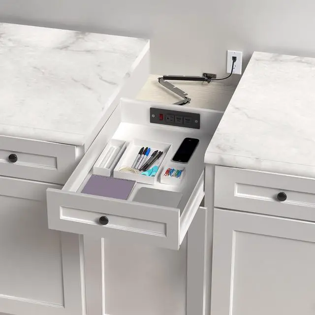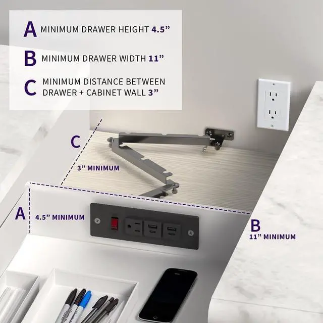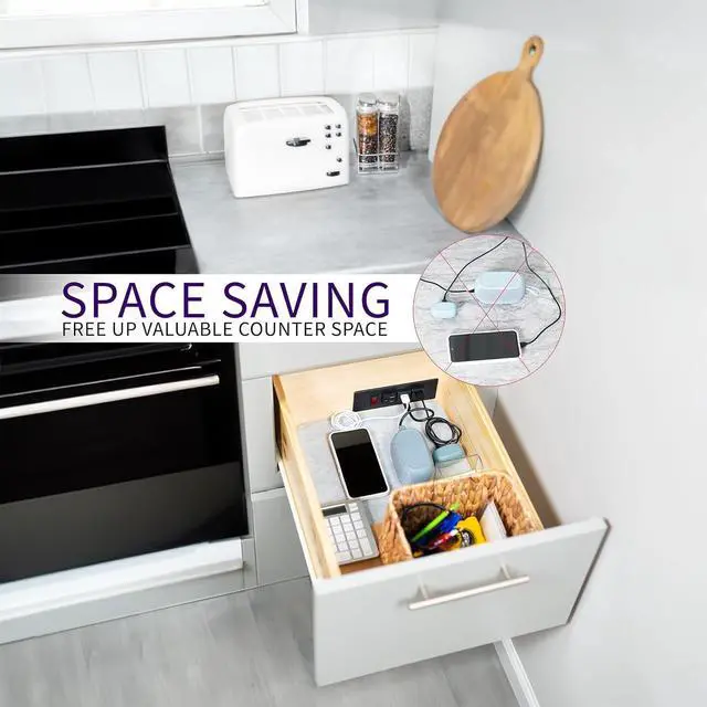 Cord Concealment - Clear the clutter on your counter or workspace with this in-drawer electrical charging station. Perfect for office drawers, cabinets, vanities, nightstands, and more!