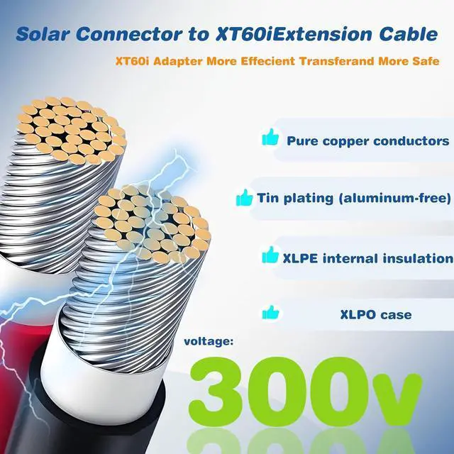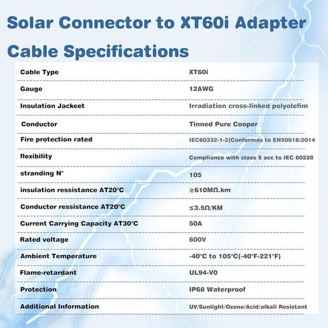 Hassle-free solar panel connectivity with a solar to XT60i cable that is specifically designed for efficient power transfer, making it an essential accessory for any solar panel kit.