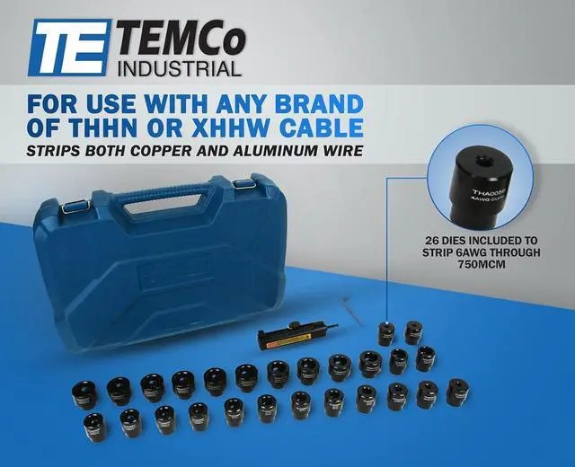 Cable Stripper will strip THHN / XHHW cable from 6 gauge to 750 MCM with varying insulation thickness.