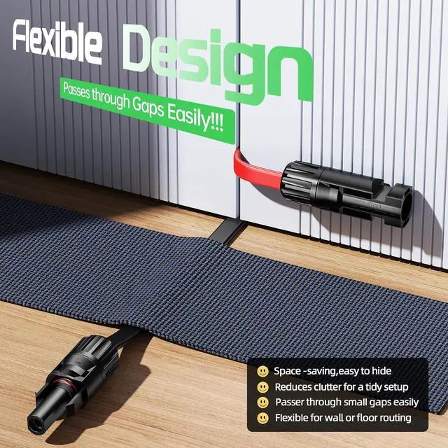 [Flexible Flat Design] Make flat solar panel cables pass through gaps easily. This flat solar wiring cable is flexible for wall or floor routing and portable for outdoor use. Provide convenience when wiring solar system.