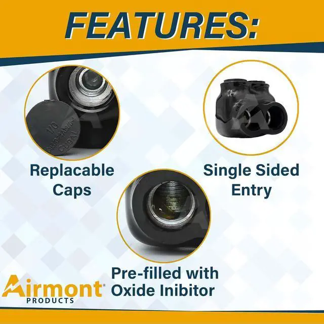 EASY RE-ENTRY: These dual-entry insulated in-line splice connectors offer easy re-entry for inspection, troubleshooting, changes, and low-cost installations. PRE-FILLED: Airmont Products black insulated in-line splice connectors are pre-filled with oxide inhibitor and offer a temperature range of -49 to 194 degrees F.