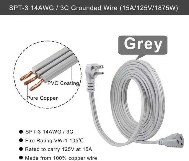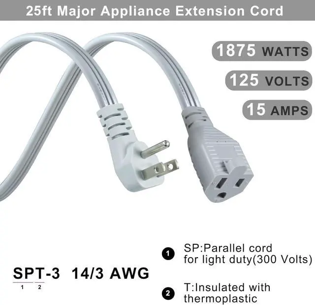 Heavy Duty Power CordSPT-3 14AWG 15A/125V/1875W. Grounded outlet with a 3-prong plug, the heavy-duty extension cord is suitable for high energy-consuming appliances. 100% pure copper conductors avoid from getting overheating. Perfect for every household with its modern design and durable material. allowing them to fit most of your power cord replacement needs.