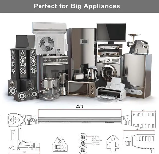 Perfect for Big AppliancesThis extension cord is made for major appliances like refrigerators, ovens, toasters, microwaves, freezers, washers, dehumidifiers, dryers, power tools, table saws, space heaters, treadmills, inflatable hot tubs, AC window units, air conditioners, dishwashers, range hood, garbage disposal, and other major appliances. For home, kitchen, garage, indoor Use Only.