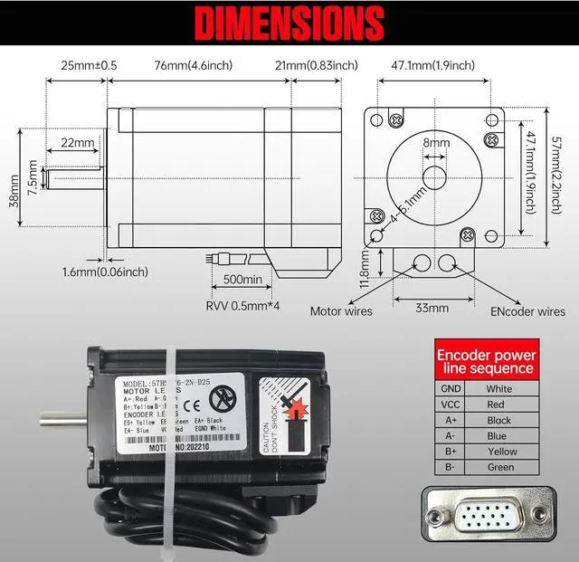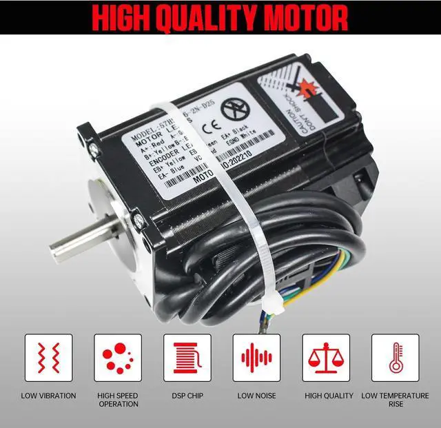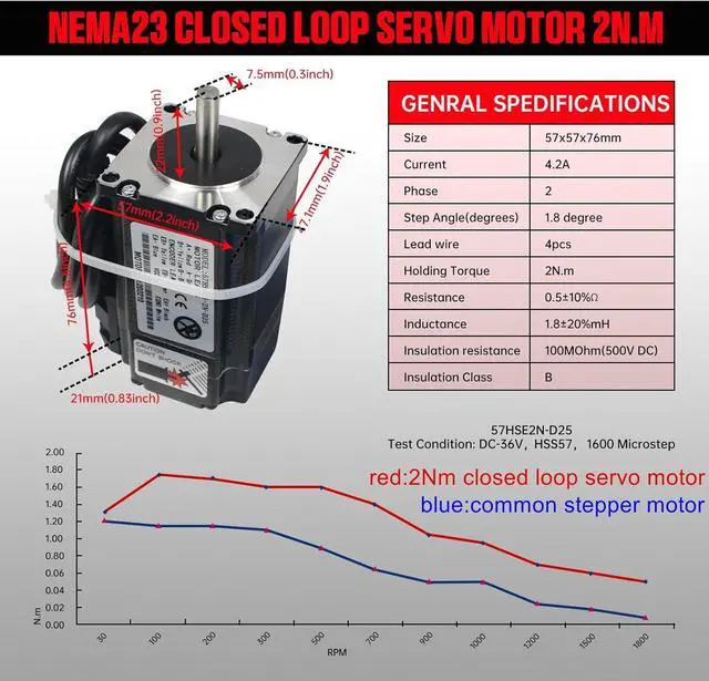 Specifications of Motor: Holding Torque: 2N.m; Current: 4.2A; Peak Current: 6A; Phase: 2; Size: 57x57x76 mm; Step Angle: 1.8 degree; Motor Lead Wire: 4-wire; Encoder lines: 1000; Insulation Class:B; Motor Weight:2.4 LB