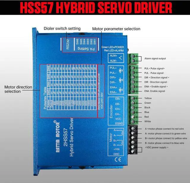 Specifications of 2HSS57 Driver: 2-Phase Hybrid Stepper Servo Driver; Frequency: 0-200KHz; Insulation resistance: >=500M; Voltage: DC 24-50V input;Pulses response frequency can reach 200KHZ; 16 kinds microsteps choice,highest 51200 microsteps/rev
