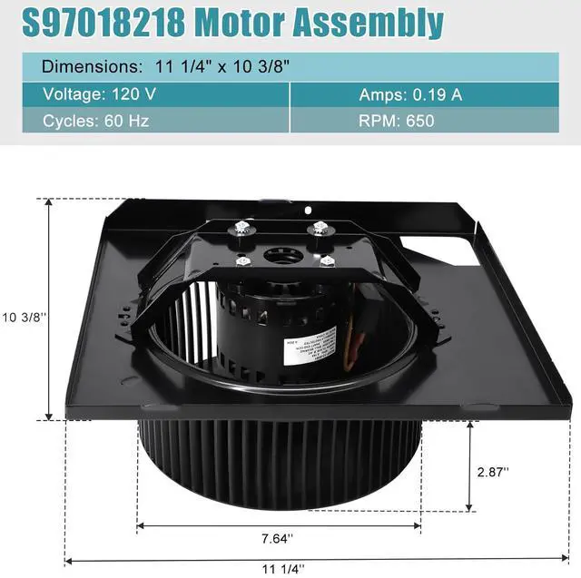 The Broan S97018218 Fan Motor Specifications: Volts: 120 V, Amps: 0.19 A, Cycles: 60 Hz, RPM: 650, Shaft Rotation: CCW, Ball Bearing, Thermally Protected, Capacitor Start; 3.3-Inch Diameter Motor. Blower Wheel: 7.64" Lx 2.87"H. Package Includes 97018218 motor, blower wheel, mounting plate, wire harness plug, rubber motor isolator