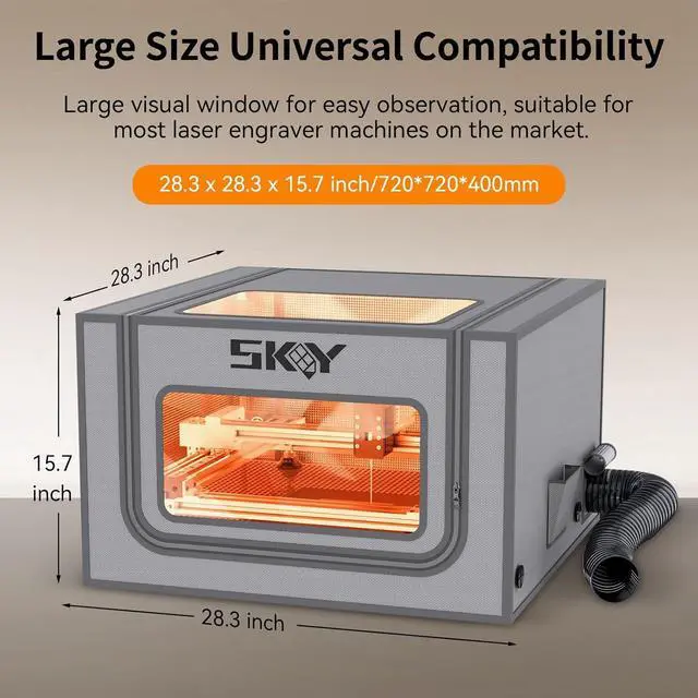[New integrated Bottom Design with Large Size, Highly Compatible]This laser engraver enclosure bottom integrated stitching prevents smoke from escaping and effectively maintains fresh ambient air and good collection of debris. Large space of 28.3*28.3*15.7 inch( 720x720x400mm). Compatible with most engraving machines on the market. Such as xtool d1, d1 pro, Creality CR-Laser Falconortur, sculpfun, atomstack laser engravers. The higher size allows to install the rotary roller, meets all your engraving needs