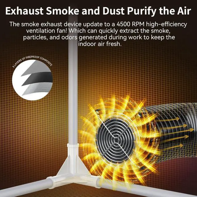 [Exhaust Smoke and Dust Purify the Air] The smoke exhaust device uses a 4500 RPM high-efficiency ventilation fan, which can quickly extract the smoke, particles and odors generated during work to keep the indoor air fresh.At the same time, the smoke exhaust pipe has been upgraded and the use of three-layer composite materials has made it difficult for smoke and dust to adsorb onto the inner wall of the aperture, reducing the residual odor of smoke