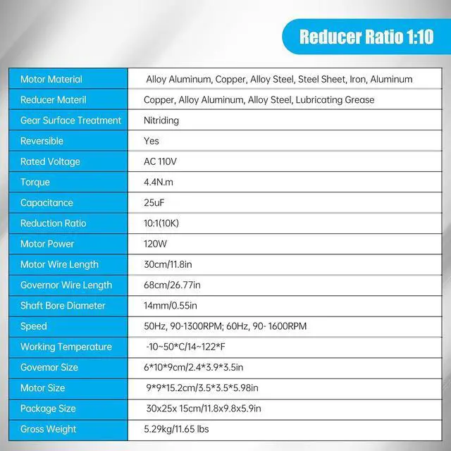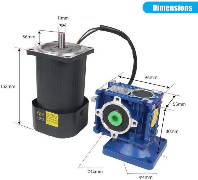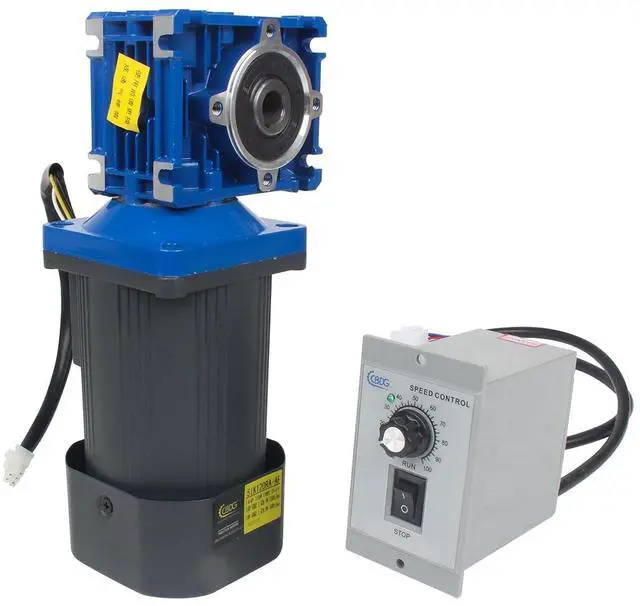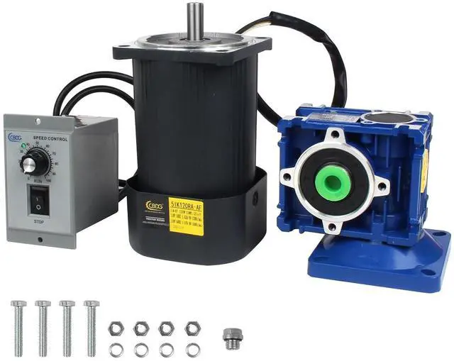 Specifications: Power:120W; Rated Voltage:110V AC; Speed:90-1300rpm 110V/50HZ / 90-1600rpm 110/60HZ; Reduction Ratio:1:10 10K; Torque:4.4N.m; Output Shaft diameter:14 mm/0.55 inch; Worm gearbox Model: NMRV30