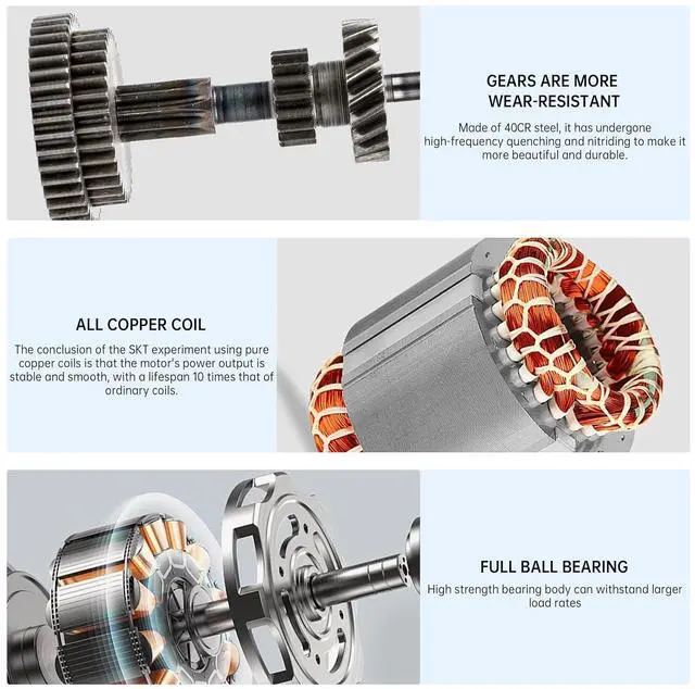 Metal gears and Ball bearings: Using metal gears for greater wear resistance, the gears are made of 40CR steel and undergo high-frequency quenching and nitriding to make them more beautiful and durable; Adopting high-quality full ball bearings, high-strength bearings can withstand larger load rates