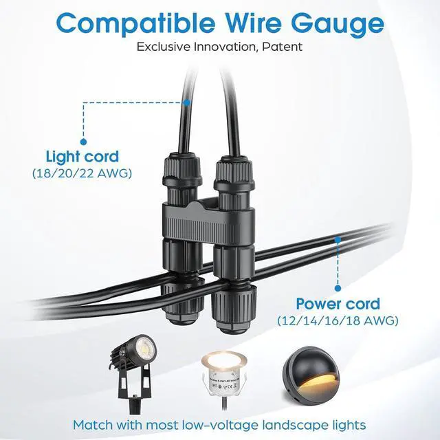 Universal 12-18 AWG FitDesigned for 12/14/16/18 gauge landscape wire.Perfect for low voltage connectors and landscape lighting systems.Widely used to power path lights, Spotlight lights,deck lights,pond pumps and more.