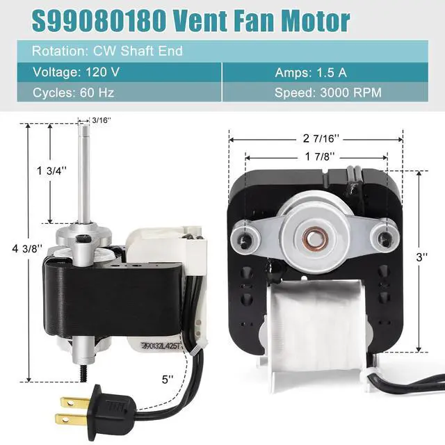 The Broan S99080180 Fan Motor Specifications: 3000RPM, 1.5Amps, 120V, 60Hz, Rotation: CW Shaft End, 5/8 Coil Stack, Continuous Duty, Air Over, Motor is Mechanically Reversible, 2-Prong Plug, C Frame Motor, 3/16" Diameter X 1-3/4" Long Shaft. UL/CSA approved for safe operation, provide 365 day after-sales service.
