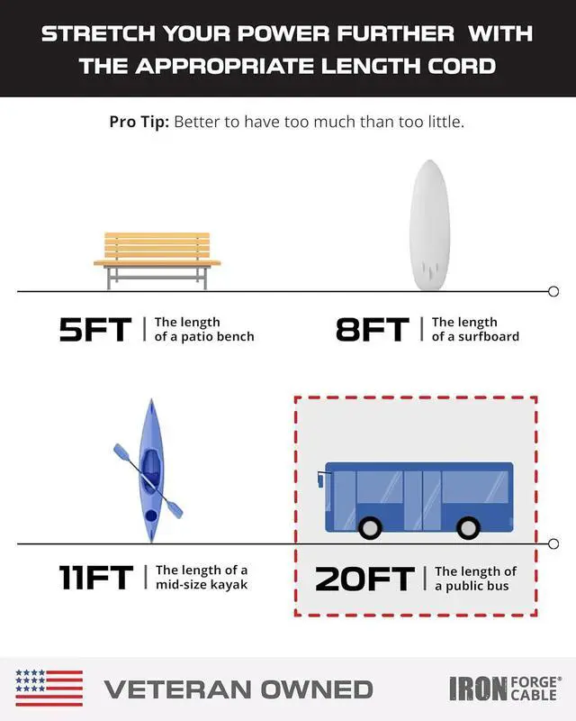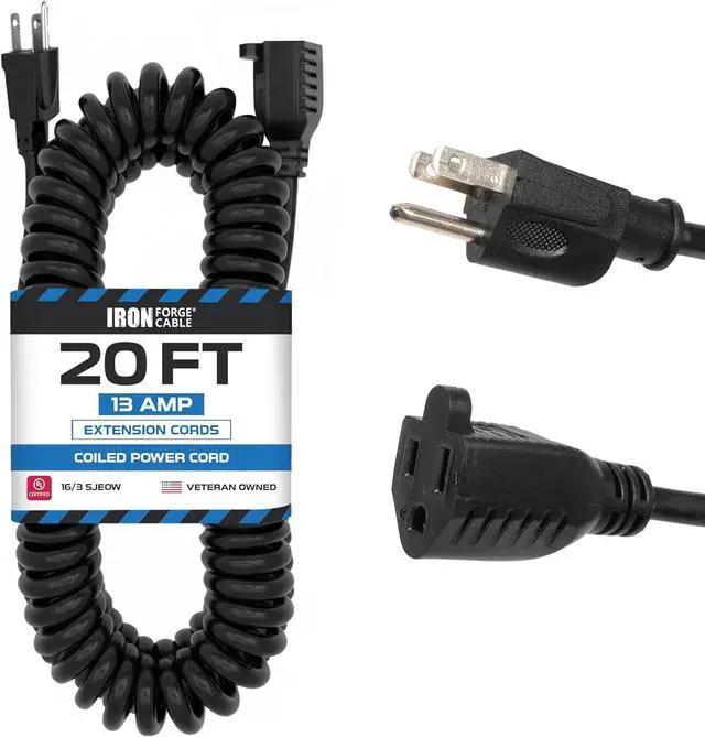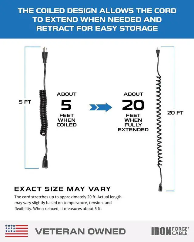 • RELIABLE OUTDOOR EXTENSION CORD: This IRON FORGE CABLE features a black coiled design, providing 25 feet of extension cord when stretching and 5 feet length unstretched. Suitable for both indoor and outdoor use.