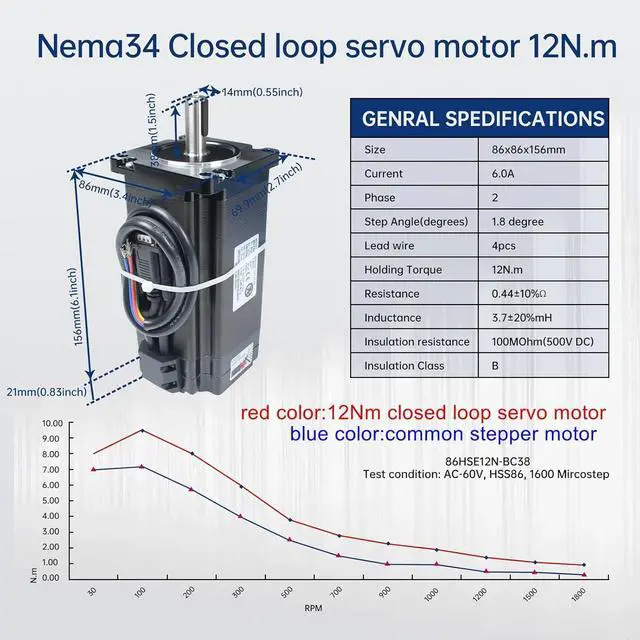 Specifications of Motor: Model is 86HSE156; Holding Torque:12N.m 1700oz-in; Rated Current:6A; Peak Current:8A; Phase:2-Phase; Size:86x86x156mm; Step Angle:1.8 degree; Motor Lead Wire: 4-Wires; Encoder lines:1000; Shaft diameter: 14mm