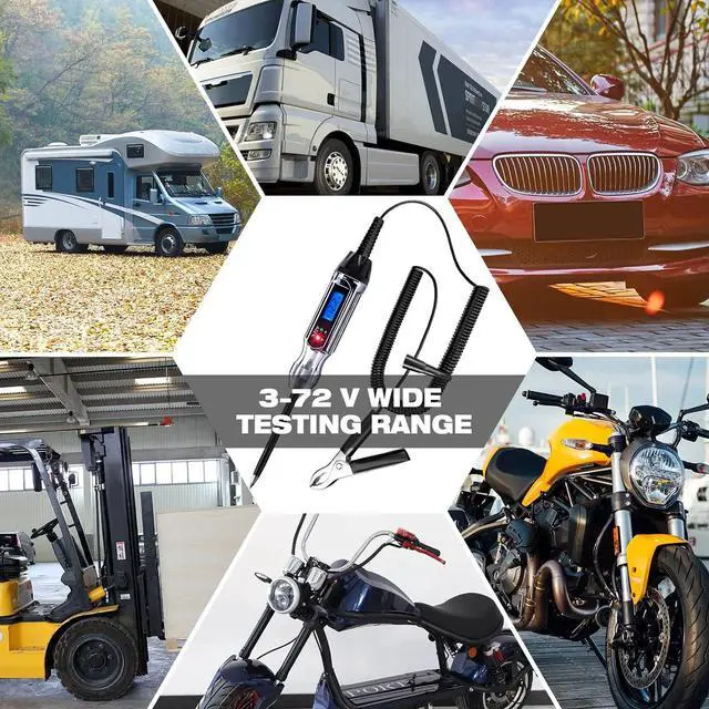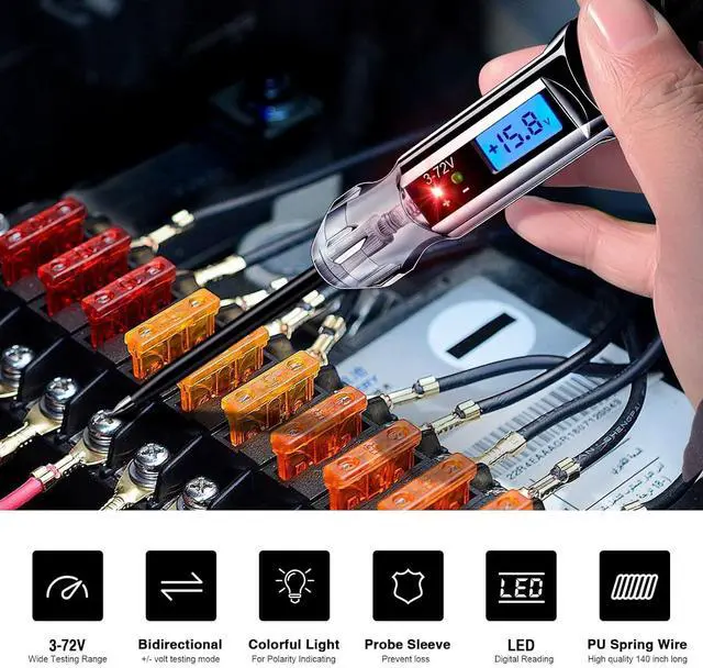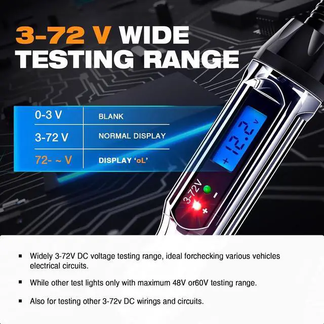 WIDE TESTING RANGE & VOLTAGE POLARITY TESTING3-72v low volt circuit test light, designed for checking various vehicles electrical circuits, such as automotive headlights, taillights, faulty sockets, fuse, also for other 3-72V DC wiring and circuits. This is also a bidirectional voltage tester with 2 color LED lights for volt polarity indicating, you can attach the alligator clamp either to ground or positive. This is really A must have tool no matter for business or household use.