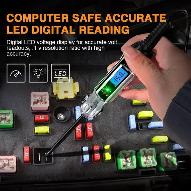 COMPUTER SAFE & BACKLIGHT DIGITAL DISPLAY PARTHeavy Duty circuit light tester with highly clear LCD digital blue backlight display screen, resolution to .1V voltage reading with high accuracy to ±0.2V, clear&visible digital readouts for day and night. JASTIND test light draws much less current than the incandescent lamp, which is less likely to damage sensitive circuits.