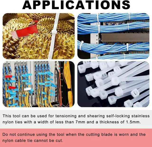 Cutting RangeThis tool is designed for the precise tensioning and cutting of self-locking stainless nylon ties, specifically those with a width not exceeding 7 mm and a thickness of 1.5 mm