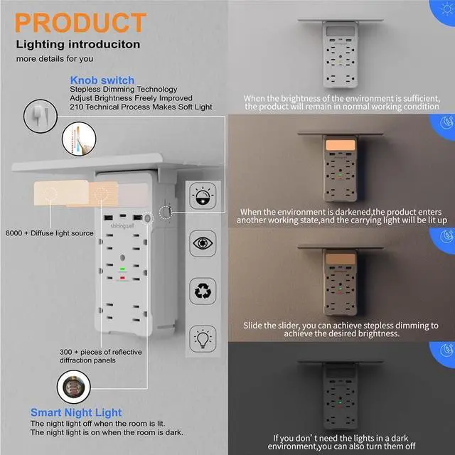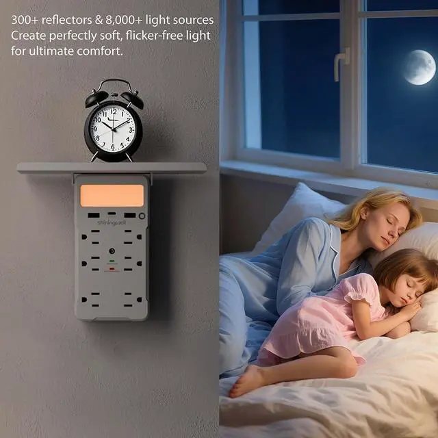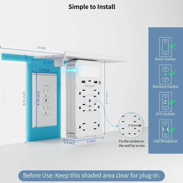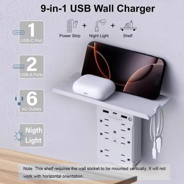 Charging Hub: This innovative power strip seamlessly combines a practical storage shelf with a multi-functional charging station. The spacious platform securely holds phones, tablets, glasses, keys, or small items, effectively organizing your desk/nightstand space. Simultaneously, it delivers power through 6 standard US outlets (NEMA 5-15R), 2 USB-A ports, and 1 USB-C port, meeting all your electronic charging needs in one place.