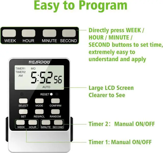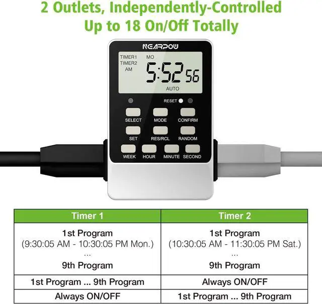 Widely Used: NEARPOW 3-prong grounded timer outlet, easily program, ideal for all kinds of electric pumps, lights, cooling and heating systems, indroor sprinklers, humidifiers, aquariums, nebulizers, ventilators and more